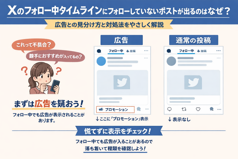 Xのフォロー中タイムラインにフォローしていないポストが出るのはなぜ?広告との見分け方と対処法をやさしく解説