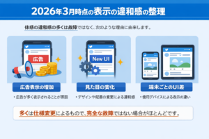 ただし、違和感の多くは完全な故障ではなく、広告表示や見た目の変化、端末ごとのUI差から生まれている場合があります。